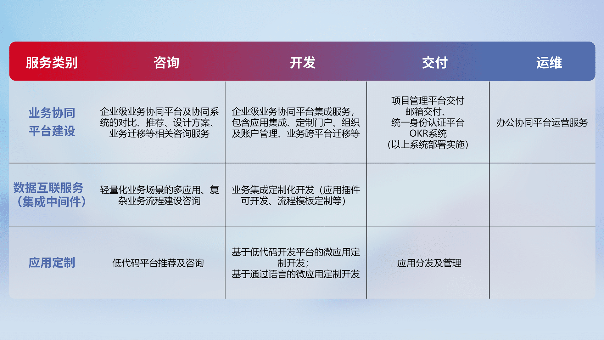 针对钉钉、、、企微、、IDaas等平台级产品提供产品的规划、、、、方案、、交付、、、定制化开发等服务,,实现如统一协同办公、、、智能客户服务、、、混合会议管理、、智能数据查询、、等业务场景,,,实现数字化转型。。。。